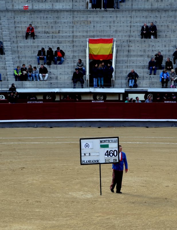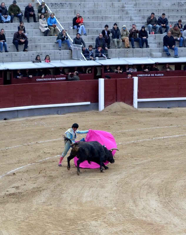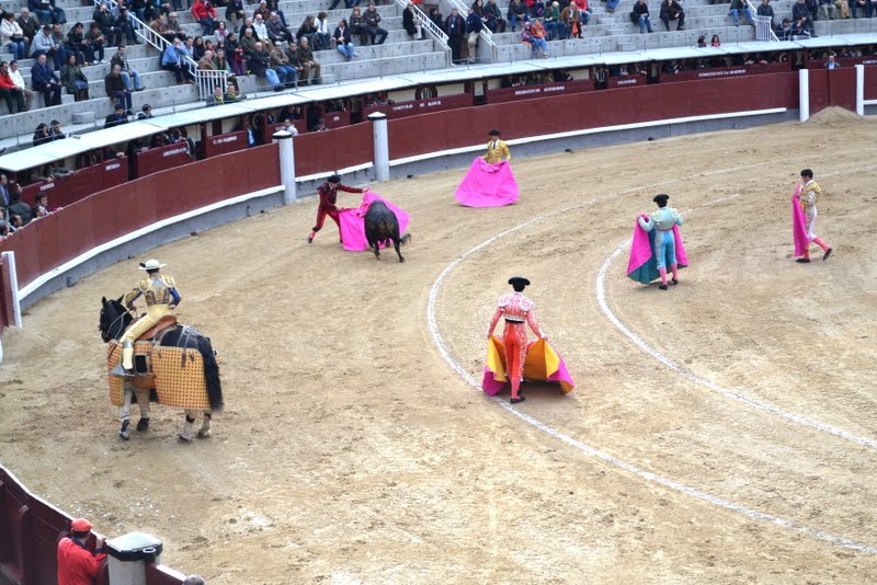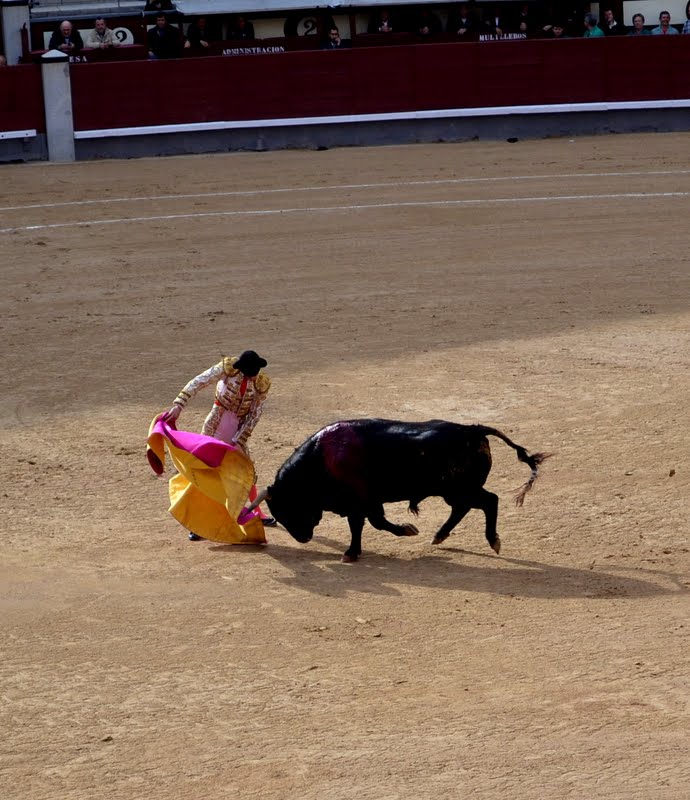 I went to watch a bull fight in the ‘Plaza de Toros de Las Ventas’ a famous bullring in Madrid. “Las Ventas” is divided into a ring or arena and a group of zones called “patios”. The arena has a diameter of 60 meters. The seating capacity is divided into 10 “tendidos” (group of 27 rows around the arena), some of them in the shade and the rest in the sun. It has a capacity of 23,000 spectators.
