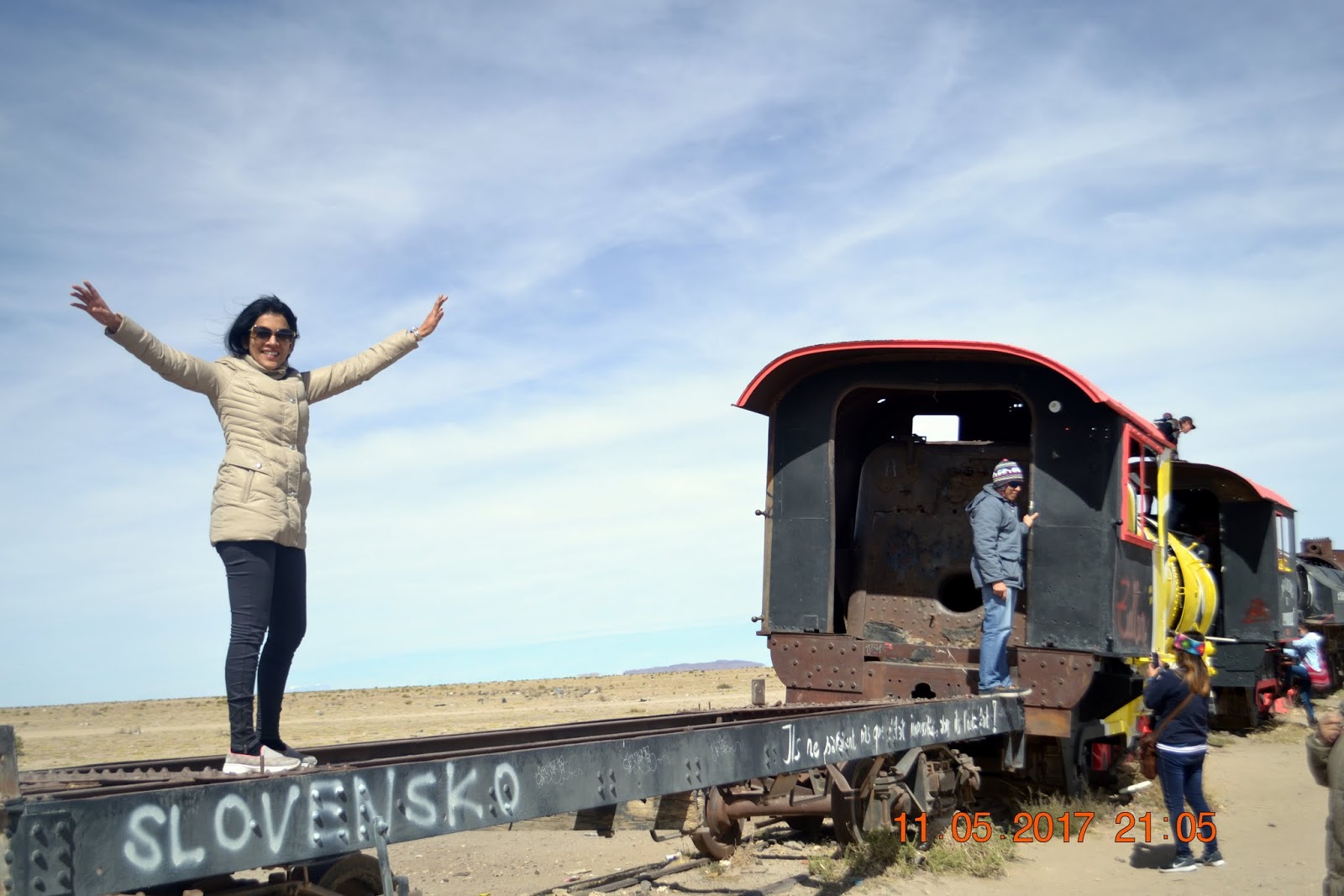 Four of us and two youngsters from Netherlands travelled together in a Toyota land cruiser. After an extensive briefing we departed Uyuni. The salt flats are one endless sea of salt covering a mind blogging 10,582 square kilometers. It is covered by a few meters of salt crust, which has an extraordinary flatness with the average elevation variations within one meter over the entire area of the Salar. The crust serves as a source of salt and covers a pool of brine, which is exceptionally rich in Lithium. It contains 50 to 70% of the world’s known lithium reserves. The Salar is virtually devoid of any wildlife or vegetation. The only vegetation that can be seen is the giant cacti reaching up to 40 feet. On a still day, the thin layer of water covering the salt forms a giant mirror reflecting the sky.